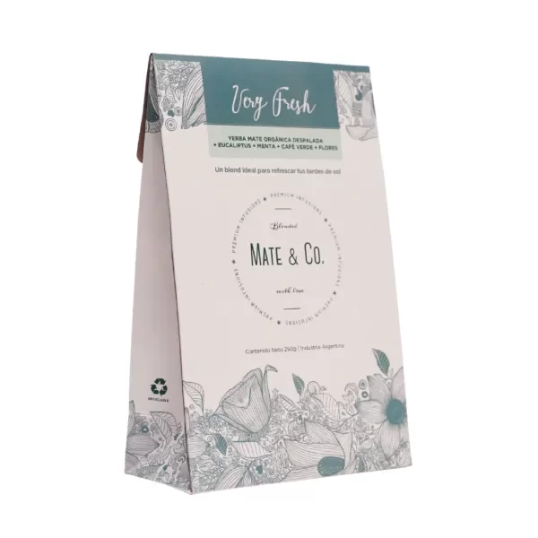 VERY FRESH: Yerba mate, eucaliptus, menta, café verde y flores. Refrescante y energizante. La yerba mate aporta su base herbal y energética, mientras que el eucaliptus y la menta despiertan los sentidos con su frescura intensa y efecto balsámico. El café verde refuerza el estímulo natural y las flores suavizan la mezcla con notas delicadas y aromáticas. Una combinación pensada para quienes buscan claridad, vitalidad y un respiro botánico en cada cebada.