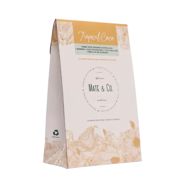 TROPICAL COCO: Yerba mate, banana, coco en escamas, coco rallado & semillas de guaraná. Exótico, energético y naturalmente dulce. La banana aporta cremosidad y dulzura frutal, el coco en sus dos formas suma textura y suavidad tropical, mientras que las semillas de guaraná intensifican el poder estimulante de la yerba mate. Una mezcla pensada para activar cuerpo y mente con sabor a verano.