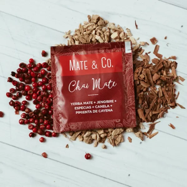CHAI: Yerba mate con jengibre, especias, canela y pimienta cayena. Una infusión intensa y especiada que fusiona la fuerza de la yerba mate con el calor del jengibre y la pimienta cayena. Las notas dulces de la canela y el toque aromático de las especias completan una mezcla estimulante, cálida y profundamente reconfortante.