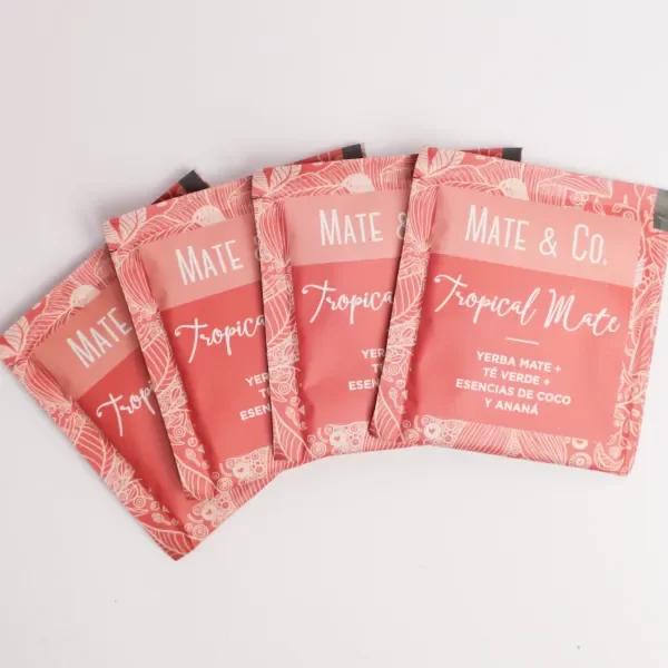 TROPICAL: Yerba mate con té verde, coco y ananá. Una mezcla exótica y refrescante que combina la energía natural de la yerba mate con la suavidad del té verde. El coco aporta cremosidad y el ananá un toque frutal vibrante, creando una infusión tropical, ligera y estimulante.