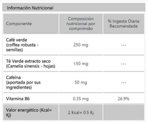 Cada comprimido contiene: Café Verde (250 g), Te verde (E.S) (150 mg), Cafeína (aportada por sus ingredientes)(50 mg), Vitamina B6(0.35 mg, 26.9% IDR).