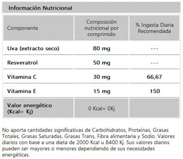Fórmula antioxidante que combina las propiedades del Resveratrol, el cuál se encuentra en la piel de las uvas y en algunos frutos rojos, junto con las del extracto de uva, vitamina C y E. Ayuda a prevenir el envejecimiento celular y protege el sistema cardiovascular.