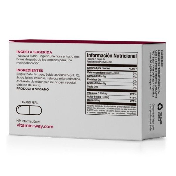 Hierro Quelato Vitamin Way® es un suplemento nutricional que combina bisglicinato de hierro, vitamina C y ácido fólico para apoyar el bienestar diario de forma completa. Gracias a su fórmula y a la tecnología de sus cápsulas gastrorresistentes Hierro Quelato Vitamin Way® es fácil de digerir y conduce a que los nutrientes se liberen donde más se absorben. Es ideal para quienes buscan un complemento de hierro bien tolerado y diseñado para apoyar procesos vitales como el transporte de oxígeno, la renovación celular y el buen funcionamiento del sistema inmune.