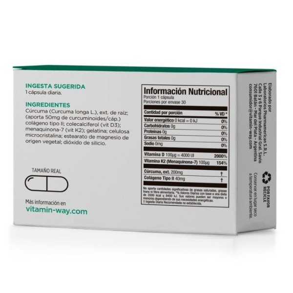 INGREDIENTES Por cápsula: Vitamina K2 (Menaquinona-7) 100 µg, vitamina D3 (colecalciferol) 100 µg = 4000 UI, colágeno tipo II 40 mg, extracto de cúrcuma 200mg.