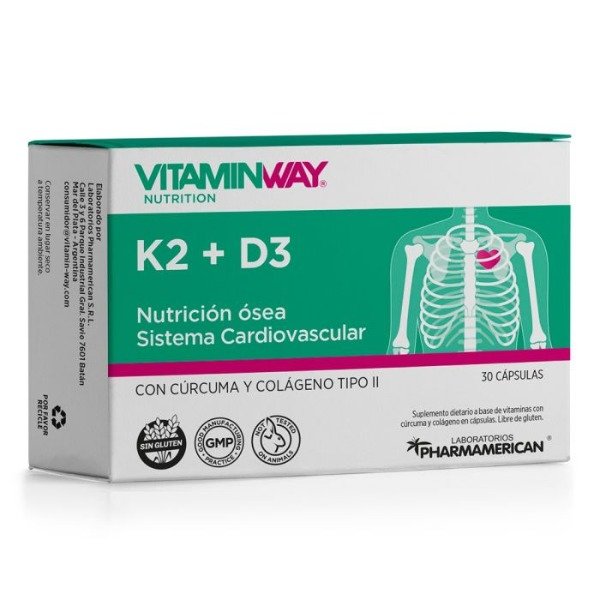 K2 + D3 Vitamin Way® es un complejo de ingredientes funcionales que favorece la nutrición ósea y el bienestar del sistema cardiovascular. Las vitaminas K2 y D3 trabajan de forma sinérgica con un doble propósito: promover la fijación de calcio en los huesos y ayudar a prevenir la calcificación de las paredes arteriales. Además, K2 + D3 Vitamin Way® aporta colágeno tipo II y cúrcuma que contribuyen con la regeneración del cartílago y el alivio de las molestias articulares.