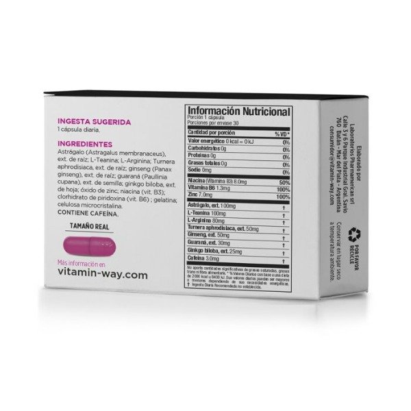 Ingredientes Por cápsula: Extracto de Astrágalo 100 mg, L-Teanina 100 mg, L-Arginina 80 mg, extracto de Turnera aphrodisiaca 50 mg, extracto de Ginseng 50 mg, extracto de Guaraná 30 mg, extracto de Ginkgo biloba 25 mg, Zinc 7.0 mg, Vitamina B3 8.0 mg, Vitamina B6 1.3 mg. CONTIENE CAFEÍNA.